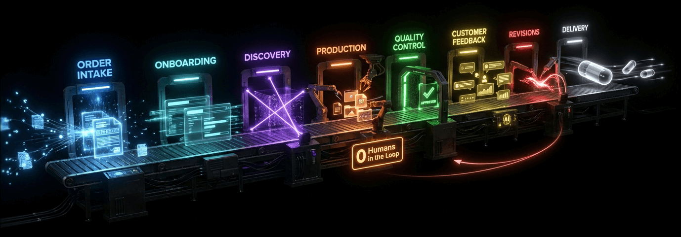 Transform any business into a fully autonomous operation. From order receipt to delivery—powered by a dark factory that never sleeps
